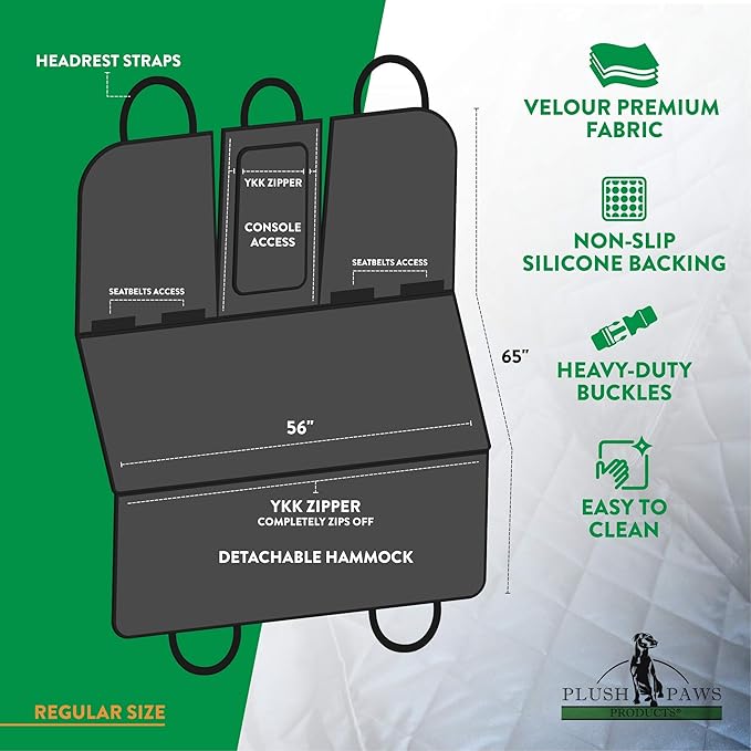 - ššš¦š¬ š§š¢ šš”š¦š§ššš: Our sizes options are REGULAR - 56''W X 65''L, EXTRA LARGE - 63''W X 68''L, and all have 9'' X 18'' SIDE FLAPS. This elastic skirt and adjustable back and headrest straps provide a seamless clean look and snug fit. Buckle the dog car seat protector to your back seat using the adjustable back strap and insert the seat anchors to secure the cover in place. The headrest strap fits most vehicles.