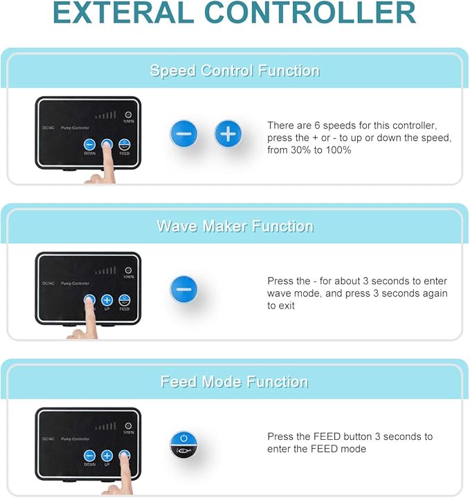 - DC Controllable water pump:6 speed adjustable,control the flow from 30% to 100% of max flow,with 10 minutes feeding mode and wave maker function;