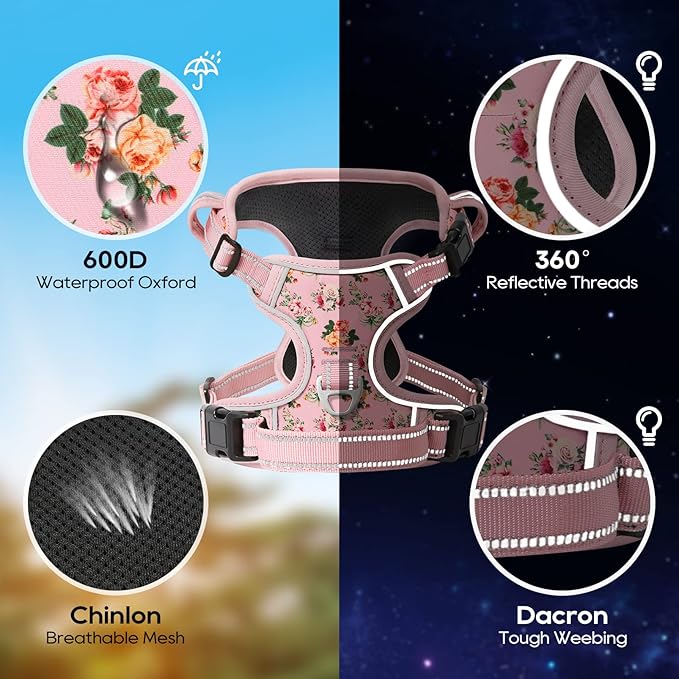 - 【MUCH SAFER & MORE COMFORTABLE】 Breathable mesh lining with soft sponge padding plate of puppy harness prevents injuries, giving extra comfort and protection with enhanced 1600D oxford fabric. The reflective material will be really nice when it gets dark. Also, your dog will be saw easily. This reflective material can make drivers have long time to react, which ensure your dog’s safety!