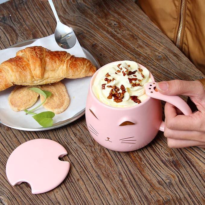 Yuwu Cat Mug Cute Coffee Mug gifts for cat lovers Ceramic Cup, Novelty Mug with Lid and Stainless Steel Spoon, Christmas Birthday Gifts Present for kids Women Girls (pink)