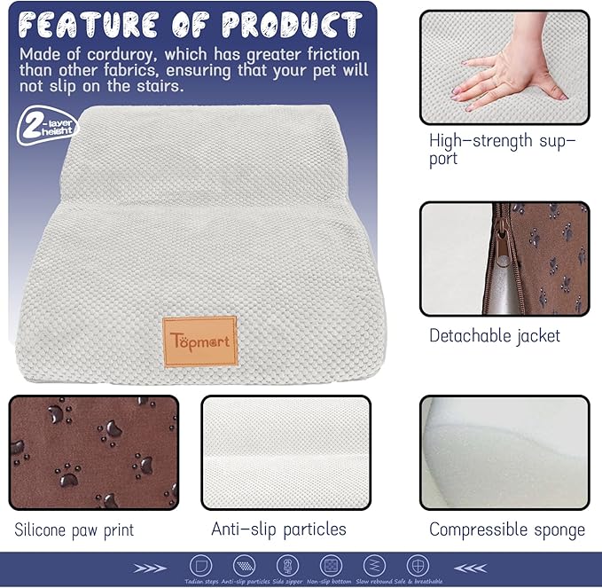 - Safer,Wider&Deeper Steps:Our dog stairs are excellent for those older dogs who are less mobile as they age or for cats with injuries. More wide and deep steps are helpful for reducing the strain that constantly jumping up and down onto lower bed,sofa can have on your pet's joints,and Topmart dog steps will not shake and slip during use. The cover made of corduroy is more frictional than other covers, pets will not slip on the stairs.