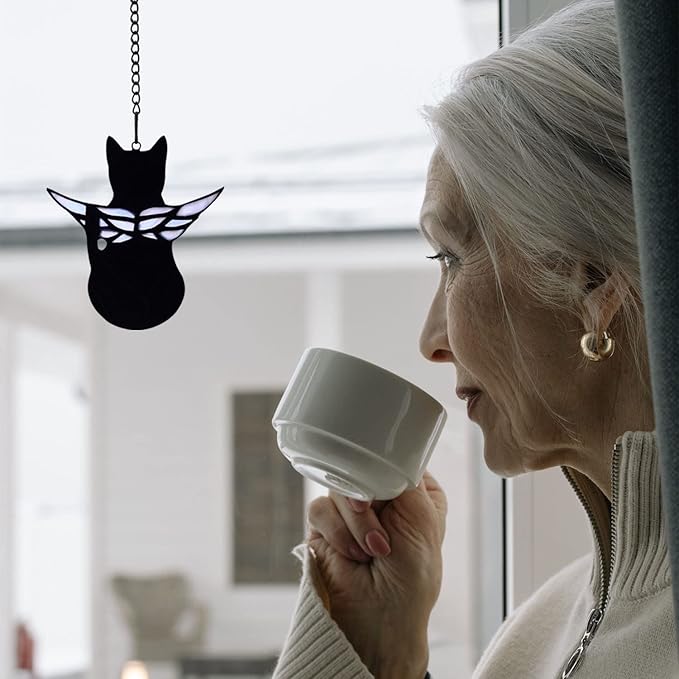 - PET CAT MEMORIAL: This is a pet memorial suncatcher for any cat lover. Great for cat stained glass window hanging on windows, cars, walls, living room shelves, cabinets, porches, balconies, front doors and bedrooms