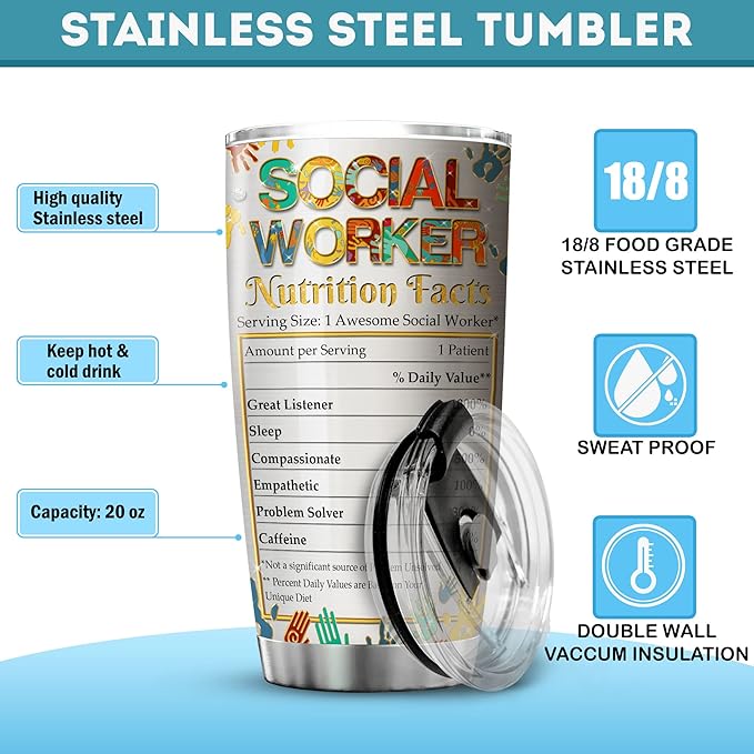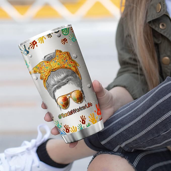 ZOXIX Social Worker Travel Mug Tumbler 20oz Graduation Appreciation Gifts For BSW DSW Colorful Messy Bun Hair Jewelry Style MSW LCSW Gift For Women Caregiver Insulated Cup With Lid