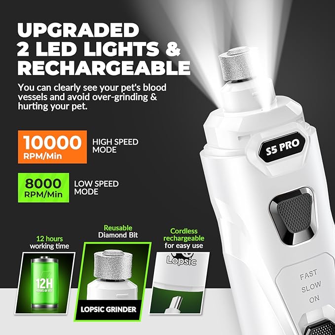 • 【Improved Precision: 2 LED Lights & Adjustable Speeds】: LOPSIC dog nail grinder for dogs features 2 LED lights that offer clear visibility of the quick, ensuring precise and safe nail trimming for your pets. The adjustable speeds(8,000 RPM to 10,000 RPM) of dog nail trimmers can adapt to small, medium and large pets nail trimming needs. When using the dog nail trimmers at the proper speed, pet nails of different hardness can be efficiently ground