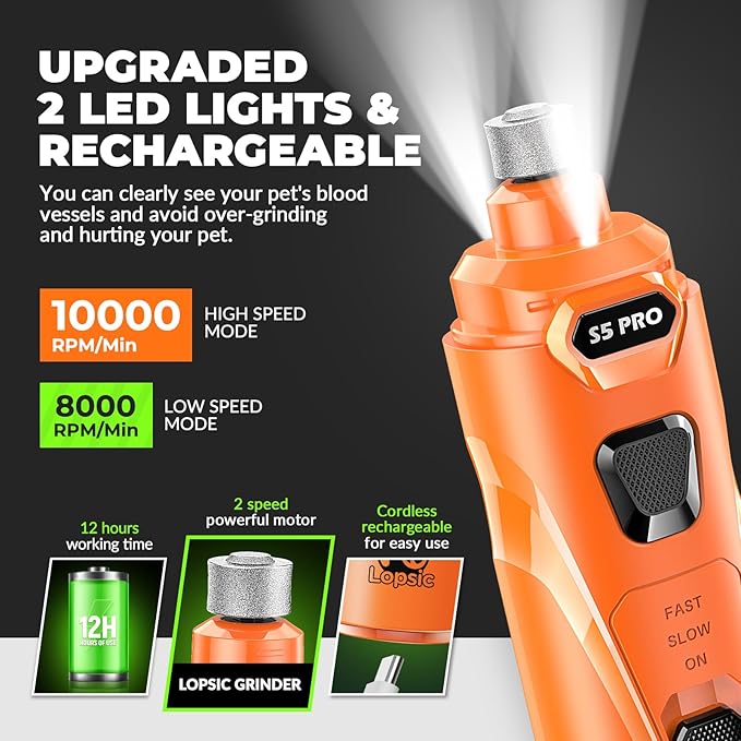• 【Improved Precision: 2 LED Lights & Adjustable Speeds】: LOPSIC dog nail grinder for dogs features 2 LED lights that offer clear visibility of the quick, ensuring precise and safe nail trimming for your pets. The adjustable speeds(8,000 RPM to 10,000 RPM) of dog nail trimmers can adapt to small, medium and large pets nail trimming needs. When using the dog nail trimmers at the proper speed, pet nails of different hardness can be efficiently ground