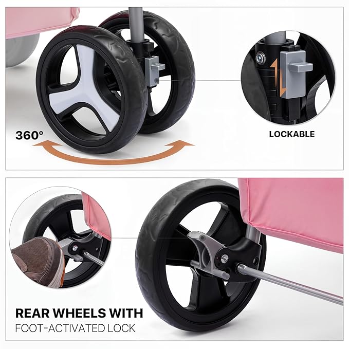 - Humanized Design - With convenient features like swivel front wheels, cup holders, and a hooded peak-top window, this pet stroller makes taking your pet out for exercise and fresh air an easy and enjoyable experience. The roomy design and undercarriage storage basket give you plenty of space to carry your essentials, too.