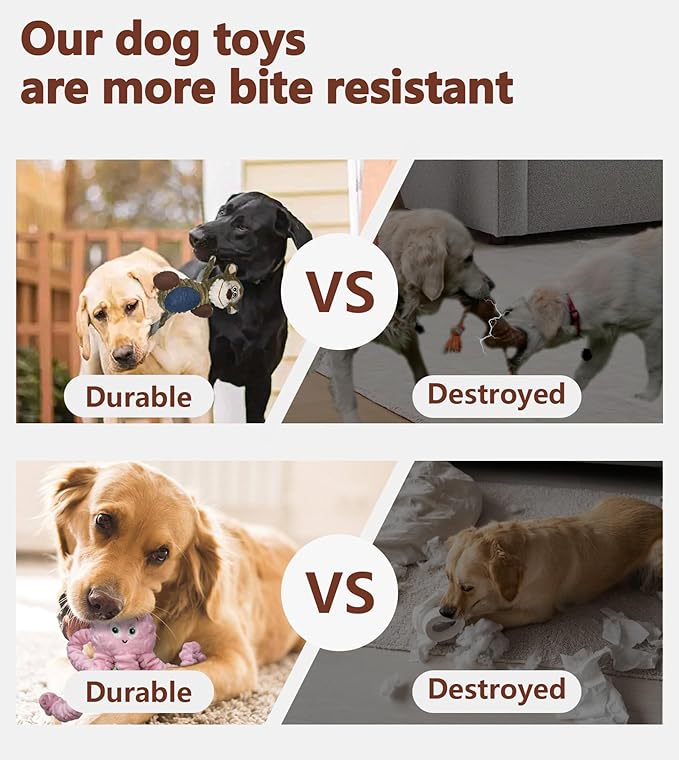- Puppy Toys for Dogs: Unlike other hard chew toys, soft material will not hurt your cute puppy. The built-in cotton is soft and elastic, never hard toys to hurt your dog's teeth. We added a waterproof fabric in the toys to prevent your dog's saliva from entering the stuffed cotton. Double suture process make your dog toy more!
