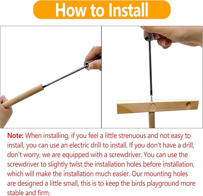 - 【Note】When installing, if you feel a little strenuous and not easy to install, you can use an electric drill to install. If you don't have a drill, don't worry, we are equipped with a screwdriver. You can use the screwdriver to slightly twist the installation holes before installation, which will make the installation much easier. Our mounting holes are designed a little small, this is to keep the birds playground more stable and firm.
