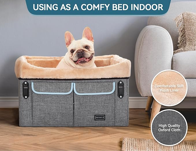 - [Fresh & Comfortable Car Travel] All-around Hollow panels support, keep the whole car seat for dogs in shape at all times. The cozy plush inner keep your pet quiet and comfortable. And there are 2 storage pockets that can transport the daily needs of pets. Dog seat protects car seats from scratches, hair, and other dirt.