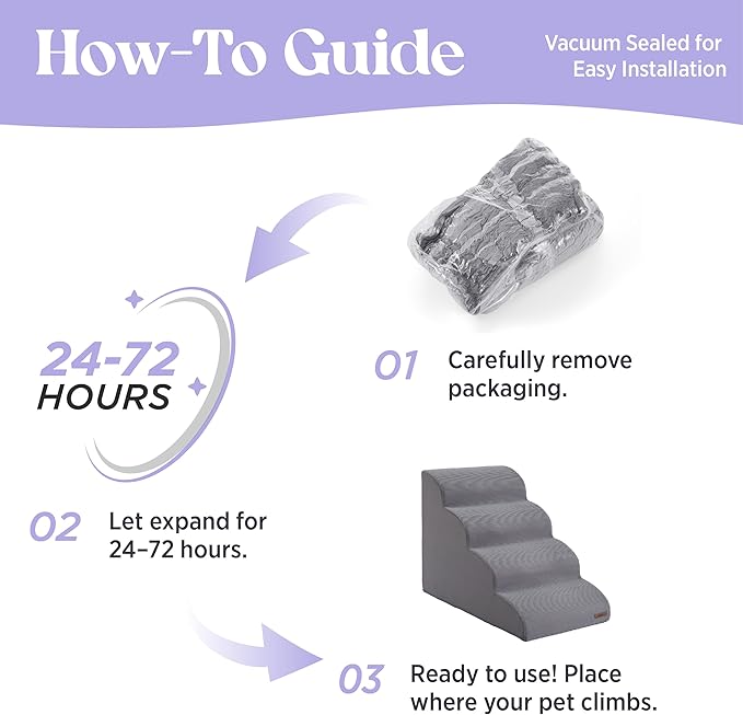 - Convenient & Easy to Use: Thoughtfully designed with your furry friend's needs in mind. A non-slip bottom featuring rubber dots ensures secure footing, while the handy built-in handle allows you to effortlessly move the ramp as needed. Note: the ramp arrives vacuum-compressed and requires no assembly. Simply give it 24-72 hours to fully expand and offer the utmost comfort for your pets.