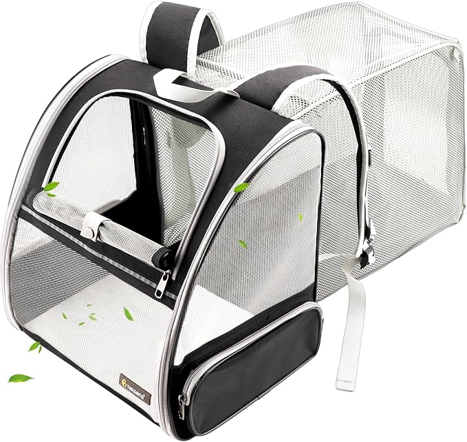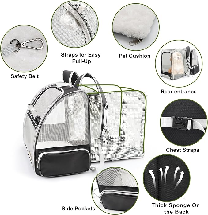 - 【Expandable for More Space】Expanded size: 13.8"L x 9.3"W x 14.2"H. This cat carrier with an expandable back design provides additional space and enhanced air circulation, allowing your pet a more comfortable and relaxed environment and reducing anxiety. The real ever bigger expandable cat backpack.
