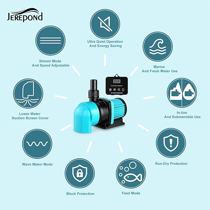 - JEREPOND 1850GPH Max flow aquarium return pump, ECO 55W DC24V return pump with 20 speeds controller, 18 feet max lift;pump dimension (L*Wx*H):7.5*3.5*4.8 inches.3 working modes;