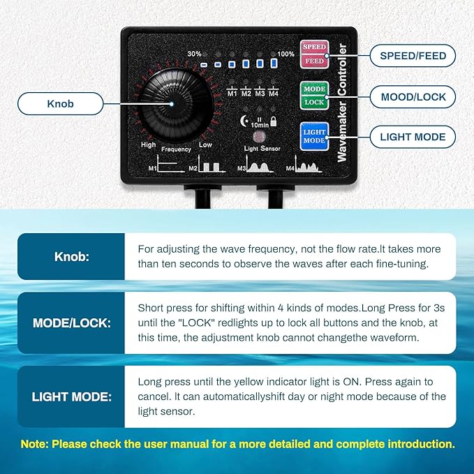 - 🐟【Multi-function Controller】: You can adjust 4 wave modes (M1/M2/M3/M4) as well as wave speed and frequency with the controller. The lock knob function helps to lock the wave parameters. There is also a feeding function and a light control function. A full range of quality services for the fish;