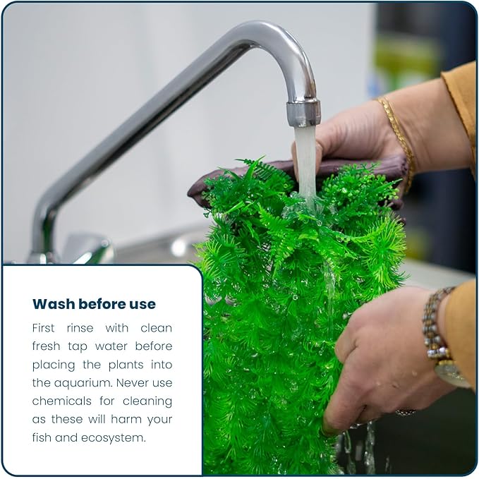 - AQUABETTA UNDERWATER ACCESSORIES 3 pcs of sturdy artificial aquarium plants in green and red. The Aquabetta plastic aquarium plant kit is packed in a nice box. Because the decorations are new they can smell. Rinse the artificial plants with warm fresh water.