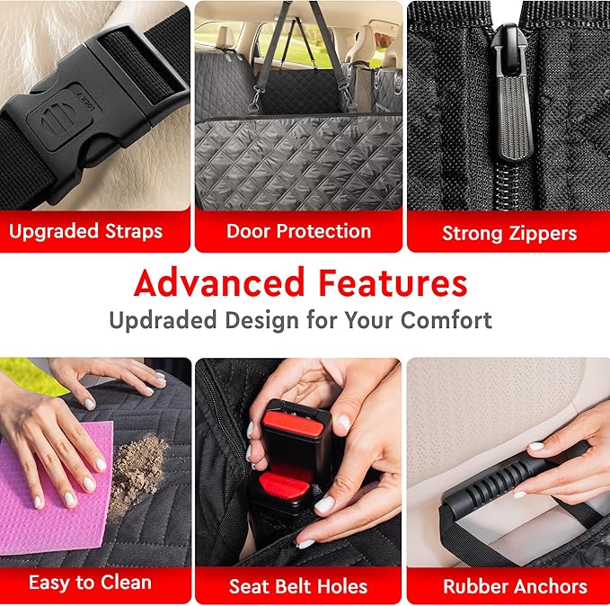 - Upgraded Design – Features a durable net between front seats, 2 storage pockets, and easy access for seat belt buckles. Enhanced straps, buckles, and zippers offer added reliability. Non-slip backing and rubber hangers keep the seat cover secure. Includes a storage bag for convenience.