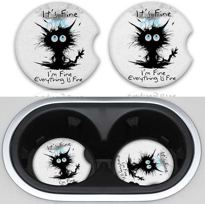 2 Pack Car Cup Holders,Universal Auto Anti Slip Insert Coaster, Rubber Car Coasters with A Finger Notch, Cute Car Assecories for Women Men (I'm Fine Cat)