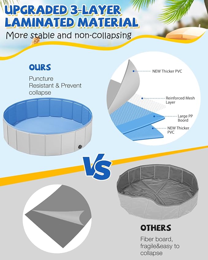 - UPGRADED THICHER MATERIAL: YSJILIDE Dog pools are made of super durable 3-layer laminated vinyl and polyester mesh to prevent outward collapse and resist punctures. The bottom is soft and flexible. Corners sealed well without leak.