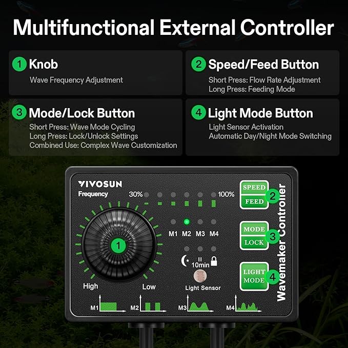 - Customizable Water Movement: Featuring a multifunctional external controller, this aquarium wave maker allows you to adjust wave modes (4 options), frequency, and flow rate; Designed to mimic natural water flow, it creates a comfortable environment tailored to your aquatic inhabitants