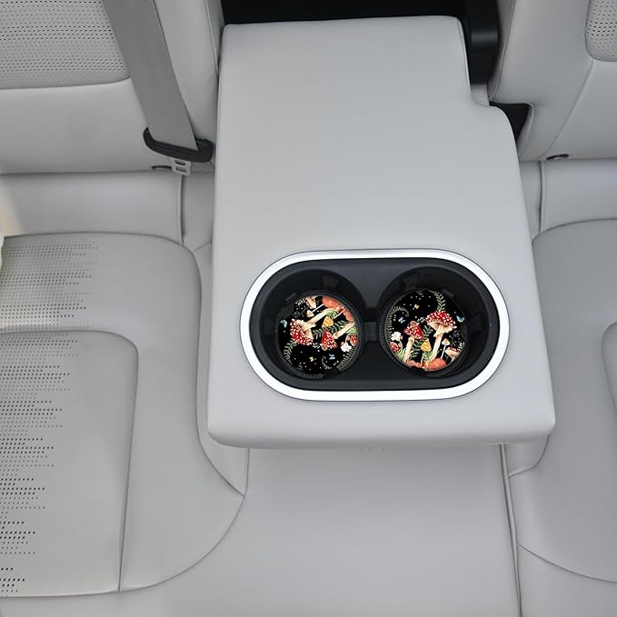 2 Pack Cute Mushroom Pattern Absorbent Car Coasters for Cup Holders,2.56" Ceramic Coasters with Cork Back and Finger Slot,Auto Accessories for Women & Men.