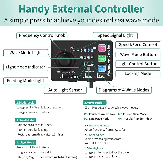- 4 Optional Waves: Press the “mode” button to switch between 4 wave modes (M1/M2/M3/M4). Easily achieve multiple sea waves with a simple controlling panel.