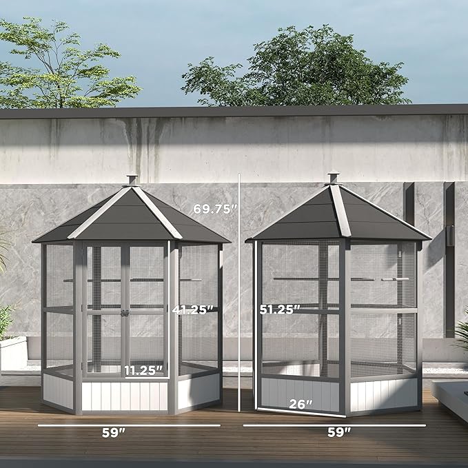 - Indoor or Outdoor Use: This outdoor bird aviary is great for either indoor or outdoor use. The water-resistant composite asphalt roof, baseboard, and finish help the birdcage endure the elements.