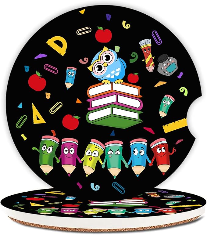 2 Pack Ceramic Cup Holders,Owl and Pencil Pattern Car Coasters Set for Women/Men,2.56" Cup Car Holder Coasters,with A Finger Notch,2.56" Ceramic Stone & Cork Base Drink Coasters.