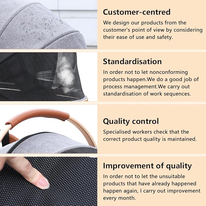 - SAFETY AND RELIABILITY: The four wheels are made of durable PU material to suit all occasions. The pushchair has large wheels and the front wheels can swivel 360°, these wheels not only ensure durability but also provide smooth and quiet operation. Whether you are walking on the sidewalk or on rough ground, our pet stroller will provide a comfortable and pleasant experience for your pet.