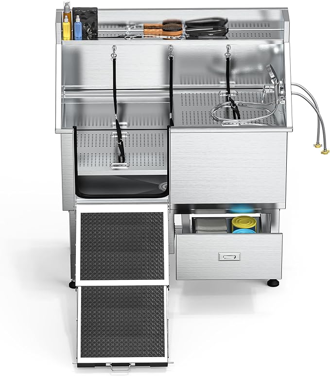 - Spacious Storage: Our pet bathing station's twin-drawer design expands storage capacity, each drawer supporting up to 22lb; The extended top shelf allows easy tool access, helping keep your grooming area tidy