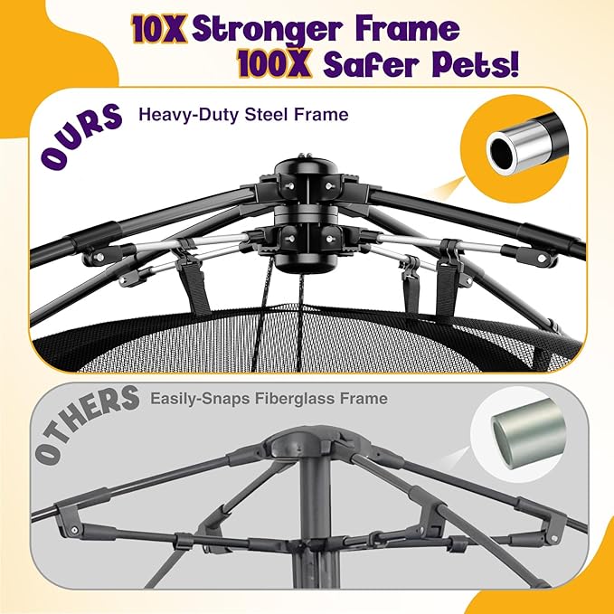 - 【Reinforced Steel Frame Built for Play & Weather】Engineered for real-world use, this catio features a reinforced steel frame that far outperforms common fiberglass alternatives. It resists tipping or collapsing under pressure from jumping, leaning, or rough weather. The mesh is double-stitched with stress-distribution seams to prevent tearing or fraying over time, even after repeated folding and unfolding. Ideal for families with active cats or multiple pets, it’s built to withstand