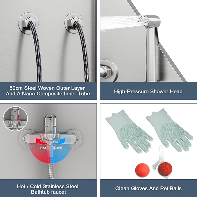 - THOUGHTFUL DESIGN FOR EASY BATHING:Measuring 50" L x 27.55" W x 61.61", this cat bath tub includes stainless steel woven water inlet pipeline and hot / cold tub faucet provides a variety of water outlets and water temperatures, offering a comfortable bathing experience. Toy ball can soothe pets' nervous emotions.Pet bath brush can be sorted out the pet hair knotted, the pet washing gloves making grooming a bonding experience for both you and your furry friend.You can achieve a professional wash at home.