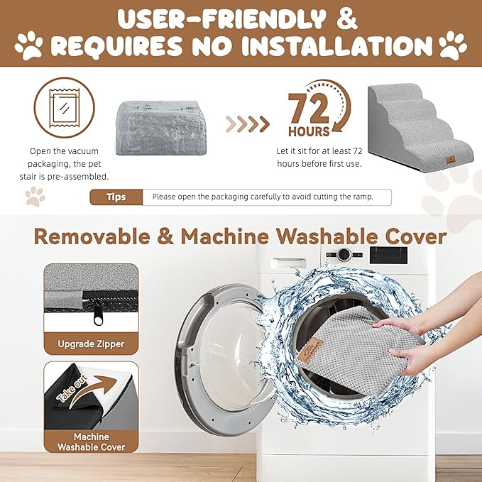 - No Assembly Required & Easy to Clean: When you open the packaging, the pet stair is already assembled. Before the first use, it should be left standing for at least 48-72 hours for the foam to fully expand. NOTE!! Open the packaging carefully to avoid cutting the stair! The outer cover can be removed for cleaning and supports machine washing or hand washing. Please note that the inner foam is not washable.