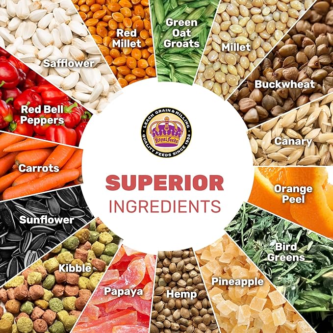 - 𝐌𝐀𝐃𝐄 𝐖𝐈𝐓𝐇 𝐑𝐄𝐀𝐋 𝐈𝐍𝐆𝐑𝐄𝐃𝐈𝐄𝐍𝐓𝐒 – Made with a wholesome mix of top-quality grains, seeds, dried fruits, and vegetables, including canary seeds, millet, sunflower, safflower, papaya, pineapple, red bell peppers, and more. These ingredients closely resemble what birds would eat in the wild, providing them with the variety and nutrition they crave while promoting better digestion, beak strength, and immunity.