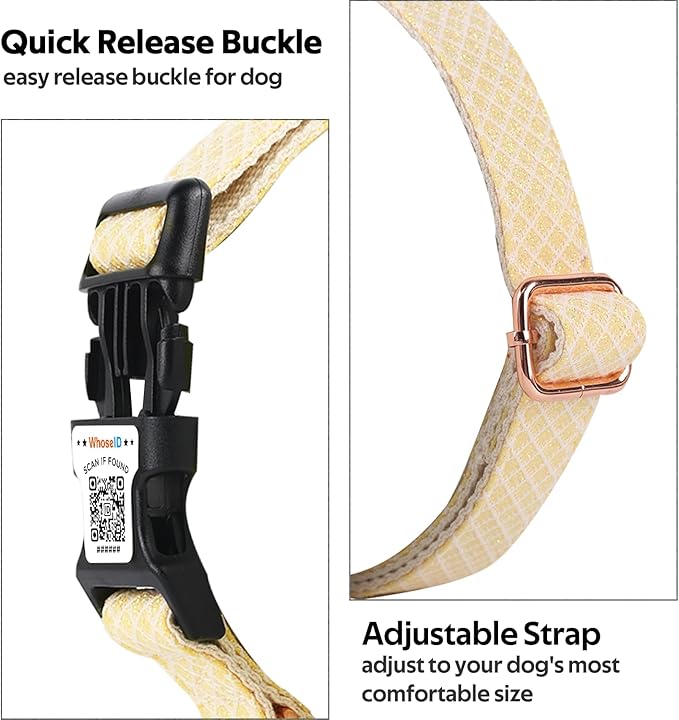 - Cute Design : WhoseID Dog Collar is both stylish and adorable with sparkling outer webbing and cotton inner webbing stitched together. Complete with gold metal hardware, this elegant dog collar is a ideal choice for your puppy