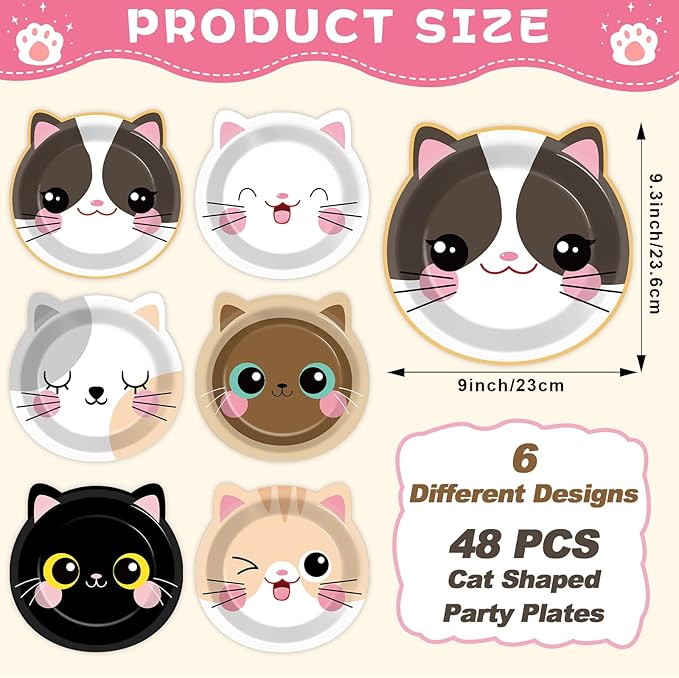 - Package includes: You'll get 48pcs of cat party plates of 9inches(23cm) in 6 designs. Brighten up your table setting with our cat theme paper plates that exude a playful and celebratory atmosphere, ideal for cat birthday party, or baby shower.