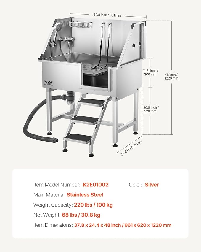 - More Comfortable Grooming: The hot and cold dual-control faucets and three water pressure settings provide versatility. The aluminum alloy soap holder keeps cleaning supplies handy, making pet grooming more convenient