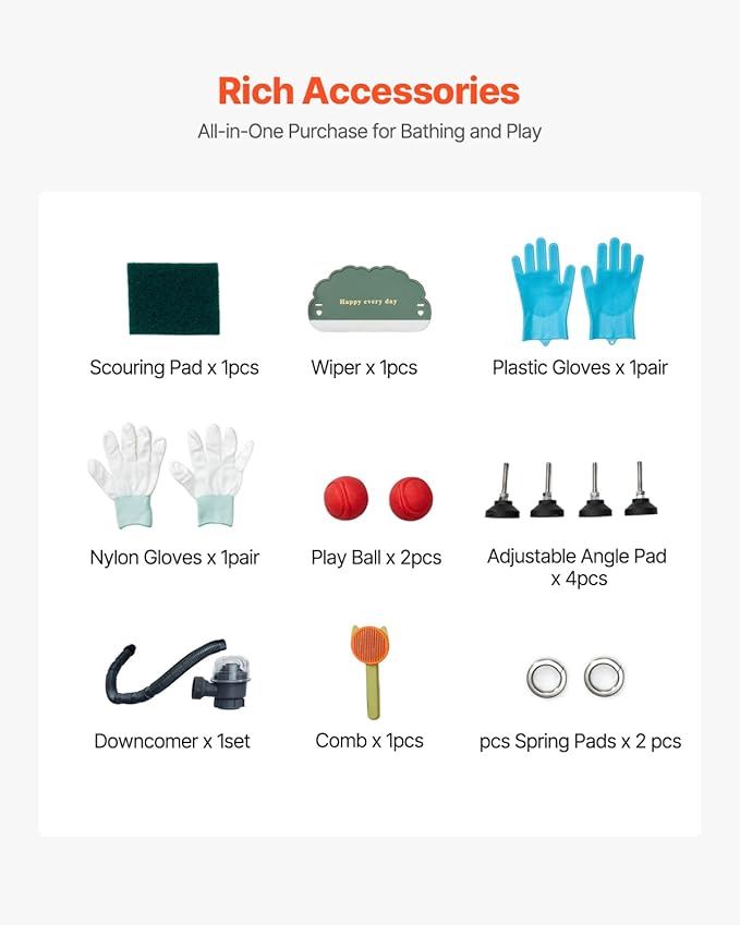- Complete Accessories: The pet washing sink comes with a showerhead, faucet, and a direct connection to a home hose for durability. It also includes a cleaning cloth, squeegee, play ball, brush, and gloves, ensuring your pet enjoys the full bathing experience