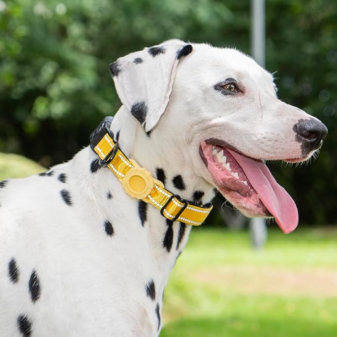 JSXD AirTag Dog Collar, Night Reflective Nylon Dog Collar for Small Medium Large Dogs,Lockable Quick Release Buckle,Padded Breathable Pet Collar with AirTag Holder (Yellow, Small)