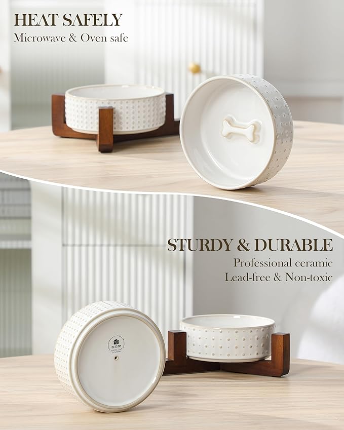 - 🦴【EASY MAINTENANCE】The ceramic bowls can be easily removed from the wooden stand for quick cleaning and convenient refilling. Featuring an active glaze finish, they are dishwasher safe and easy to clean by hand. Microwave safe as well, these bowls allow you to warm up your pet's food whenever needed.