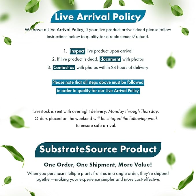 - SubstrateSource inspects each plant prior to shipping and ships all plants in healthy, stable condition with proper packing materials to ensure its safe arrival during shipping. Each plant is backed with a 100% dead-on-arrival replacement guarantee. To qualify, customers must provide a photo of the DOA plant within 24 hours of delivery.