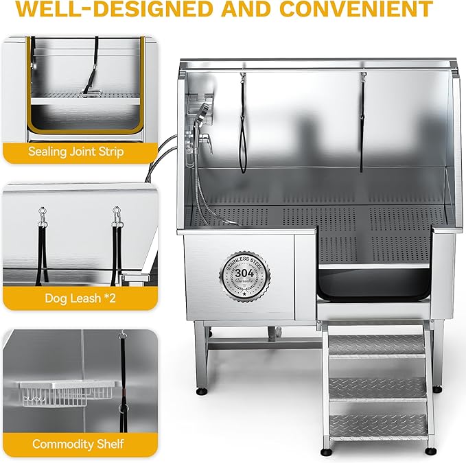 - Durable 304 Stainless Steel Tub Body: With a 330 lb weight capacity, this pet bathtub is built for long-lasting use; The fully welded, one-piece design prevents leaks, while the smooth surface allows for easy cleaning and maintenance